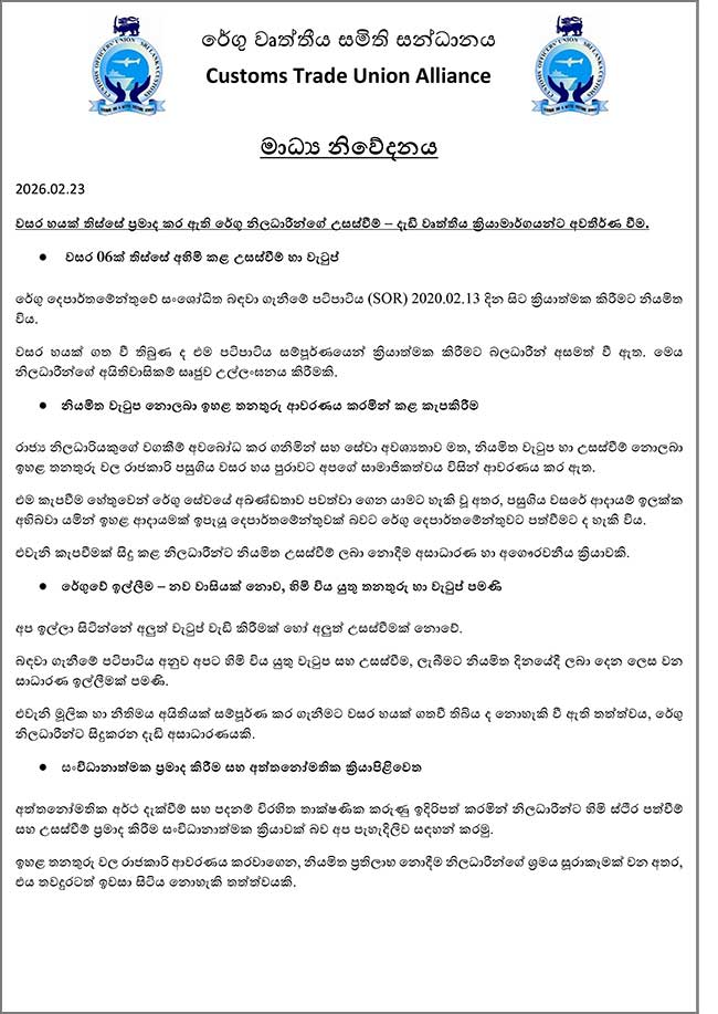වසර 6ක් පුරා ප්‍රමාද කර ඇති රේගු නිලධාරීන්ගේ උසස්වීම් හා වැටුප් මෙන්ම තවත් ගැටලු කිහිපයක් සම්බන්ධයෙන් වහාම ලිඛිත, සාධාරණ විසඳුම් ලබා නොදෙන්නේ නම් අකමැත්තෙන් වුවද දැඩි වෘත්තීය ක්‍රියාමාර්ගයකට අවතීර්ණ වන බව රේගු වෘත්තීය සමිති සන්ධානය පවසයි.